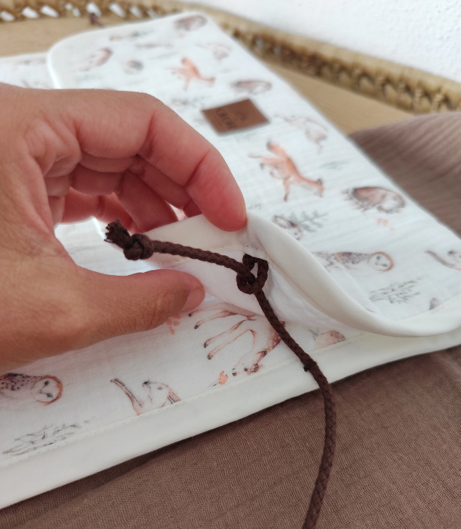 Feitas em Musselina, com enchimento fofo, fecha na lateral com cordão de cor chocolate.