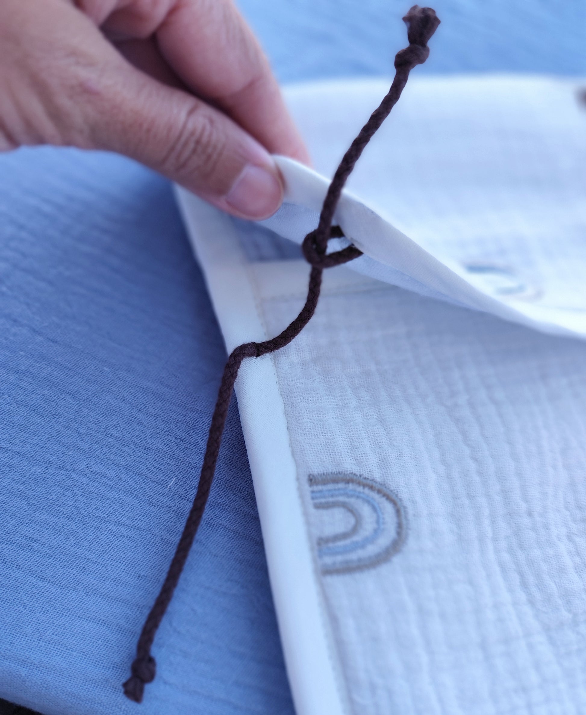 Feitas em Musselina, com enchimento fofo, fecha na lateral com cordão de cor chocolate.