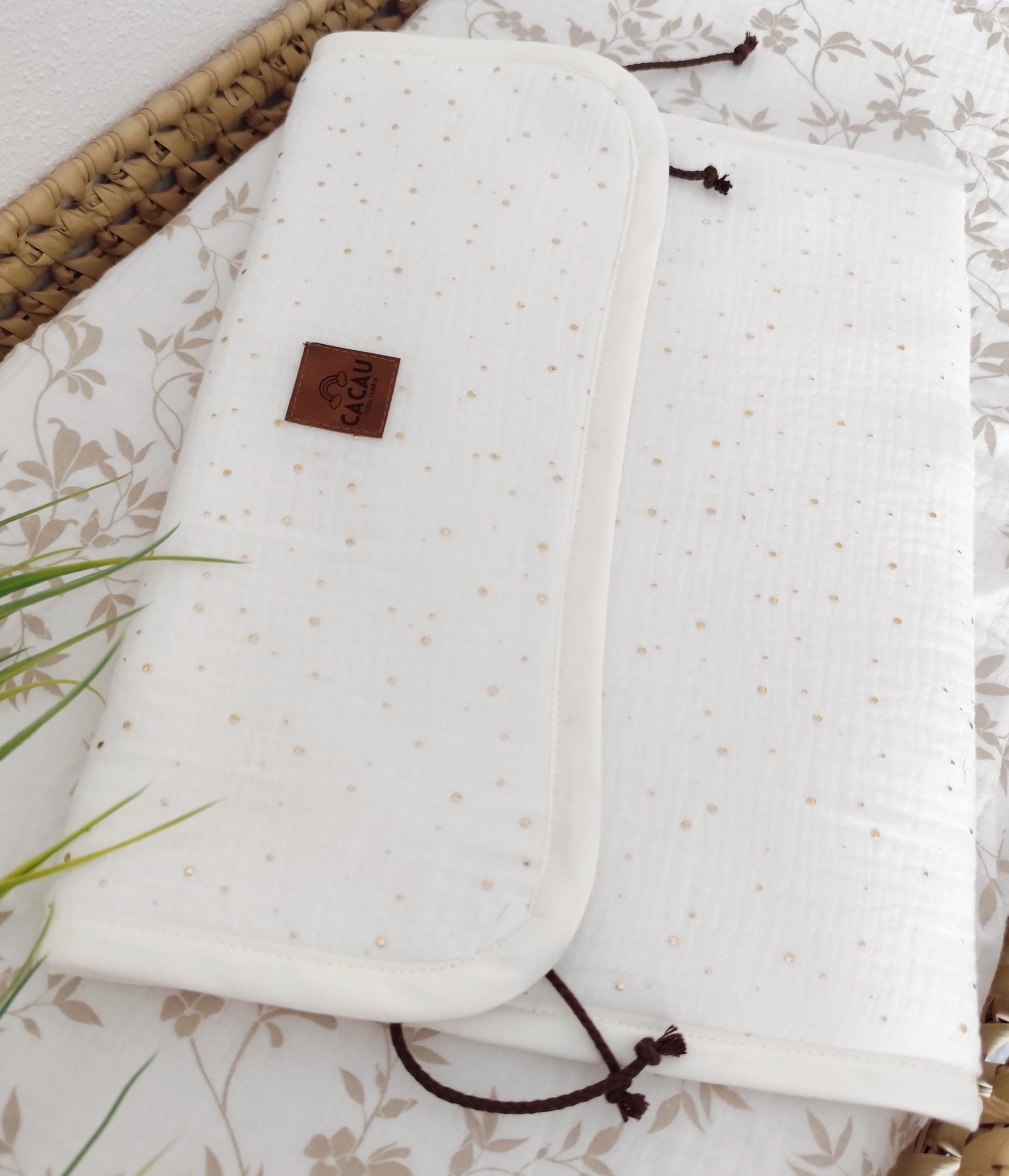 Feitas em Musselina, com enchimento fofo, fecha na lateral com cordão de cor chocolate.