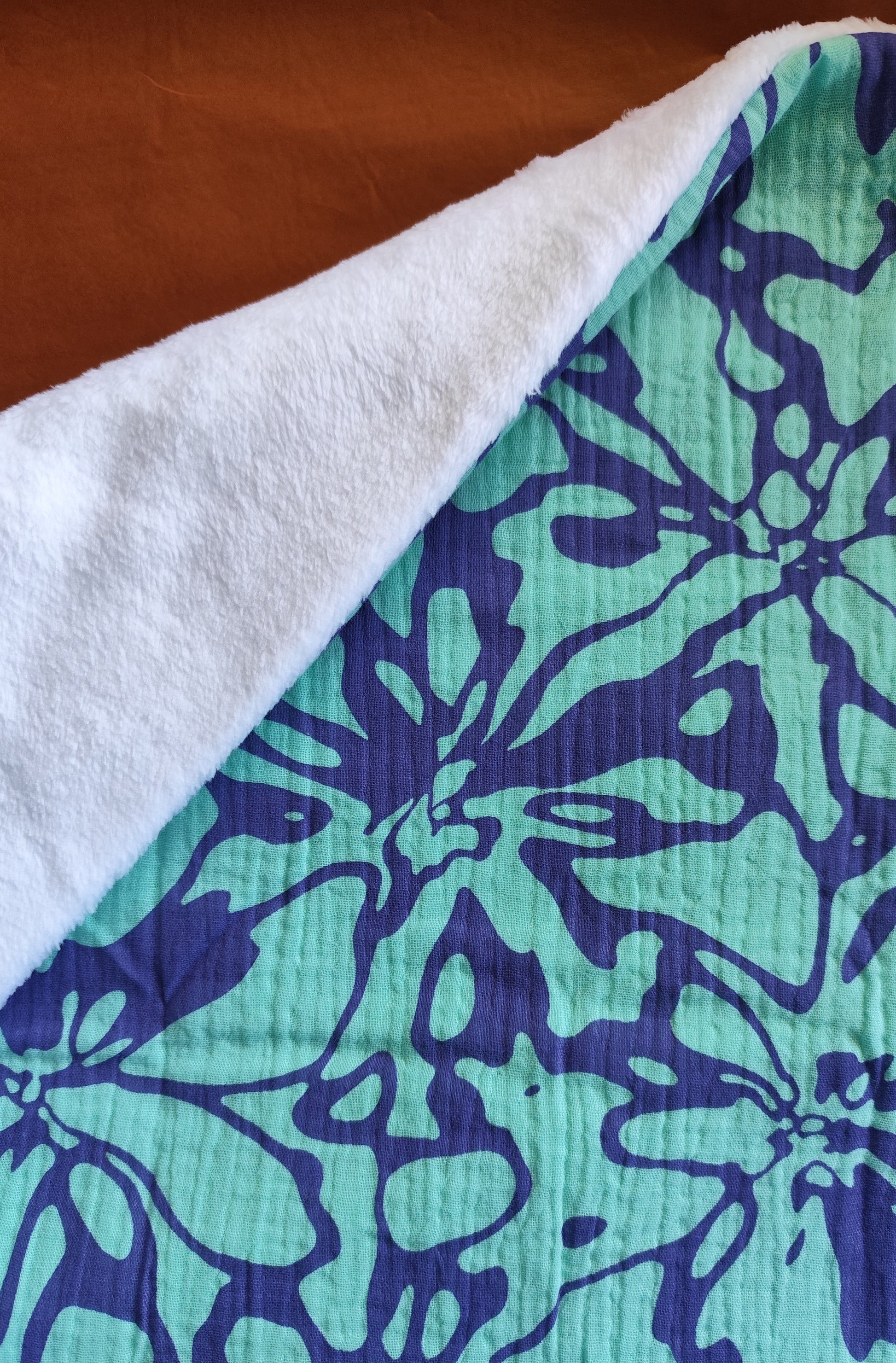 De um lado Musselina 100% algodão e do outro pêlo sintético coralina, o mais macio.