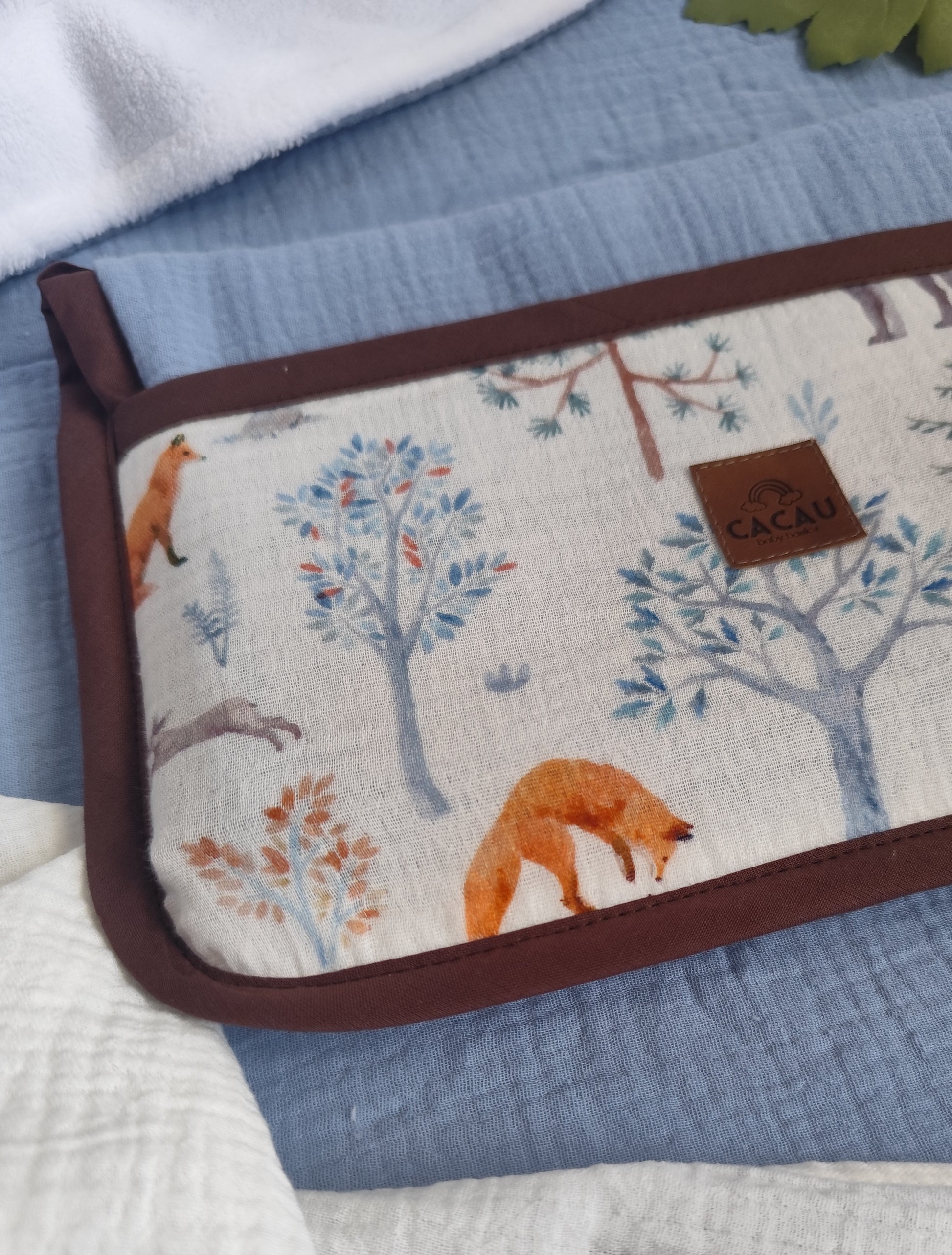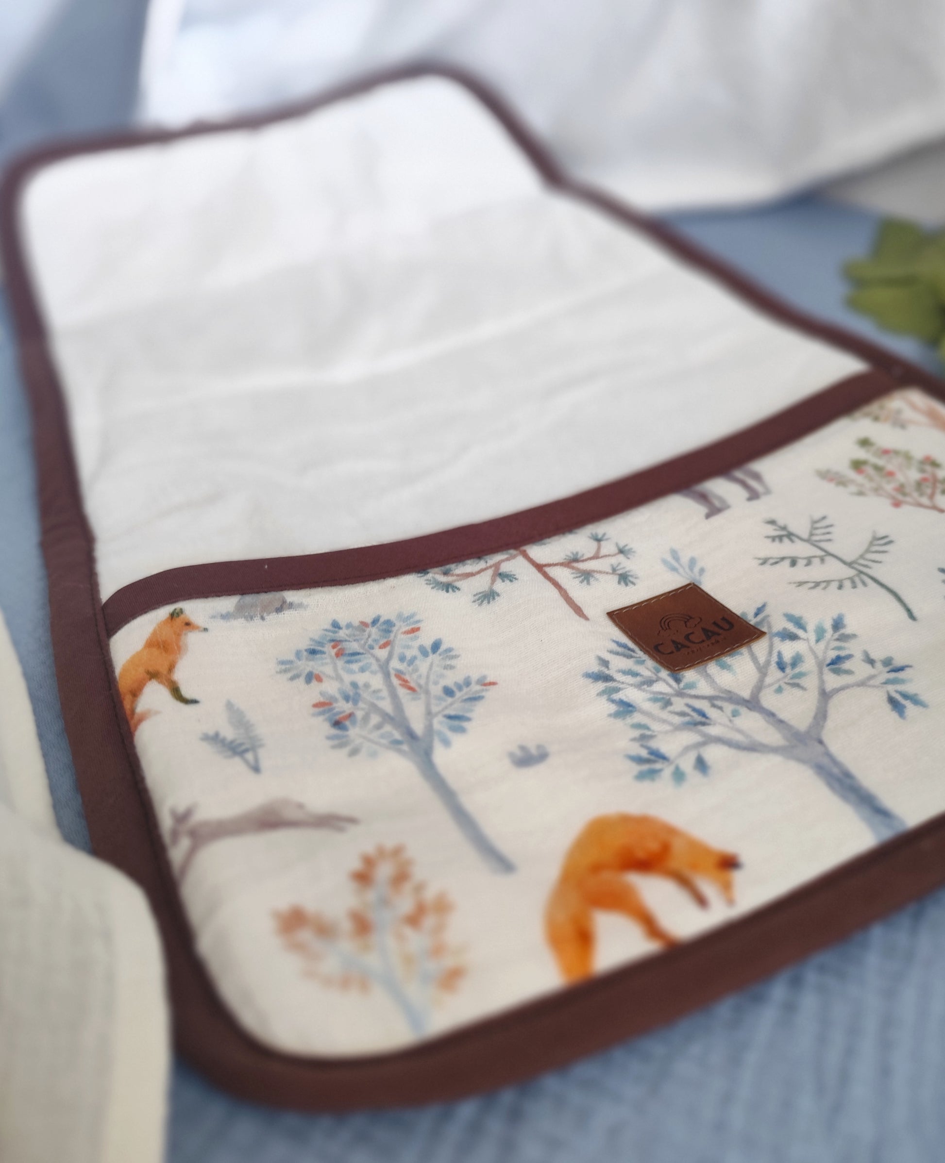 Feito à mão em Musselina e Turco, este muda fraldas portátil tem enchimento fofo para garantir conforto em qualquer superfície.