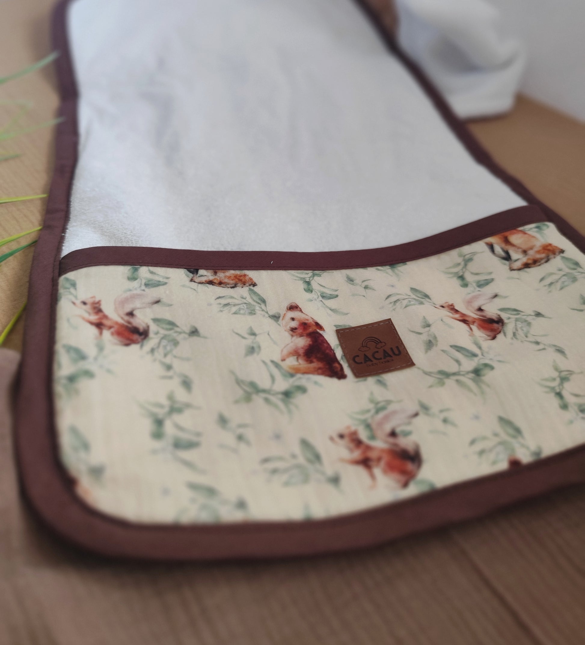 Feito à mão em Musselina e Turco, este muda fraldas portátil tem enchimento fofo para garantir conforto em qualquer superfície.